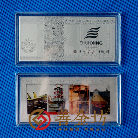 “大连顺兴海洋船舶工程有限公司成立20周年银钞”由999纯银打造,采用双面超薄压铸、印钞造币工艺铸造。图案通过镜面工艺、砂面工艺结合变化而来,将999纯银打造成薄如纸而极具艺术表现力的纯银艺术品。银钞规格150mm*70mm,成色99.9%,含纯银20克。