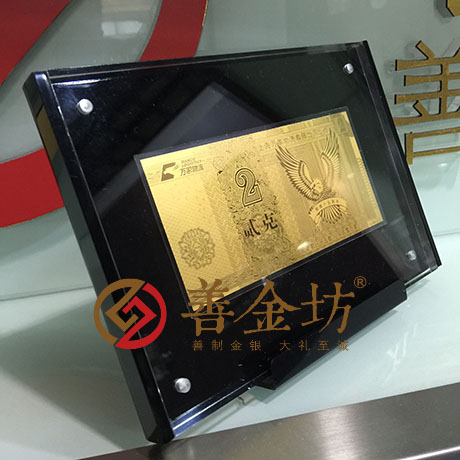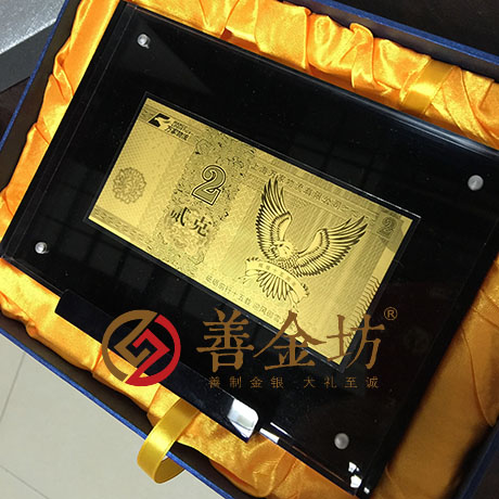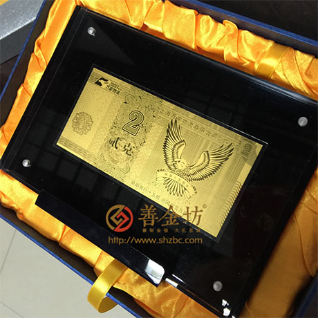 “上海万家物流有限公司成立15周年金钞”由999纯金打造,采用双面超薄压铸、印钞造币工艺铸造。图案通过镜面工艺、砂面工艺结合变化而来,将999纯金打造成薄如纸而极具艺术表现力的纯金艺术品。金钞规格130mm*62mm,成色99.9%,含纯金2克。