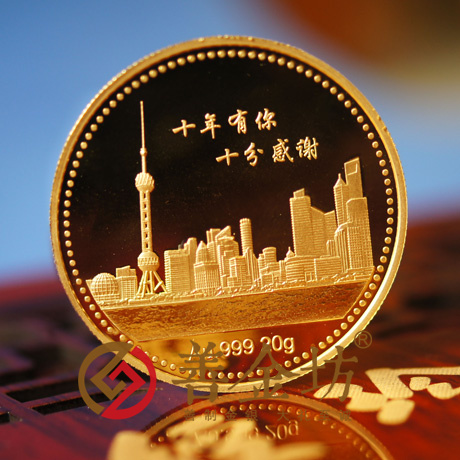 材质:Au.999 规格:直径35mm 克重:20g设计说明:正面图案“上海华安创新科技发展有限公司”、“2003-2013“字样及10周年纪念标志;背面图案“十年有你 十分感谢”、“Au.999 20g“字样及东方明珠图案。