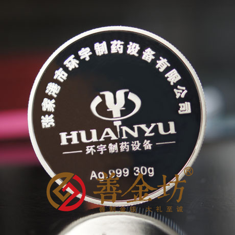 为庆祝张家港市环宇制药设备有限公司新厂房落成纪念,特制作此章以资纪念。正面图案:“张家港市环宇制药设备有限公司”、“Ag.999 30g”字样及公司LOGO;背面图案:“ZHANGJIAGANG HUANYU PHARMACEUTICAL EQUIPMENT CO., LTD.”、“落成纪念”字样及公司大楼图案。银章直径40毫米,成色99.9%,含纯银30克。 (另直径35毫米,成色99.9%,含纯银16克)该纪念章由上海善金坊实业有限公司制造。成色标准,重量合格,质量精制。谨此证明。