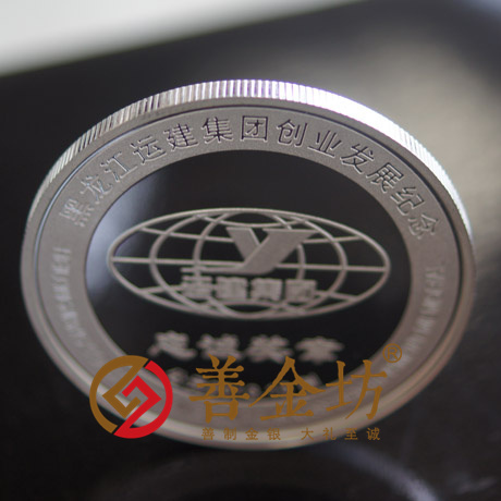 正面图案:“黑龙江运建集团创业发展纪念”、“HEILONGJIANG CONSTRUCTION GROUP BUSINESS DEVELOPMENT MEMORIAL”、“忠诚奖章”、“公元2013.10制”字样及公司LOGO ;背面图案:“黑龙江运建集团”、“HEILONGJIANG YUNJIAN GROUP COMPAY”、“Ag.999 50g”字样及董事长头像。