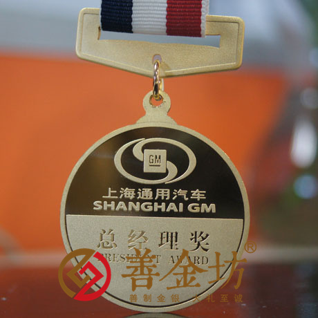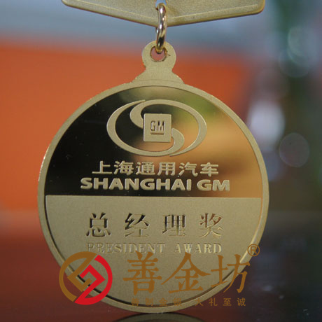 上海通用汽车有限公司为表彰该年度对公司作出巨大杰出贡献的员工及团队,特制作此章以资纪念。金章图案:上海通用汽车有限公司LOGO、、“总经理奖”、“PRESIDENT AWARD”字样。金章直径45毫米,成色99.9%,含纯金50克。该纪念章由上海善金坊实业有限公司制造。成色标准,重量合格,质量精制。谨此证明。