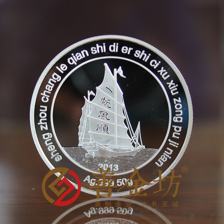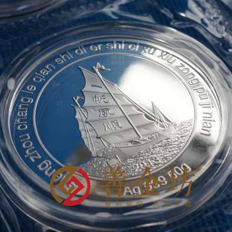 正面图案:镌有“嵊州长乐钱氏第二十次续修宗谱纪念”、“一世祖武肃王 钱镠 852-932” 字样及一世祖武肃王像图案。背面图案:镌有“sheng zhou chang le qian shi di er shi ci xu xiu zong pu ji nian”、“Ag.999 50g 2013”字样及一帆风顺图案。银章直径50毫米,成色99.9%,含纯银50克。