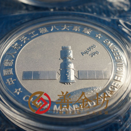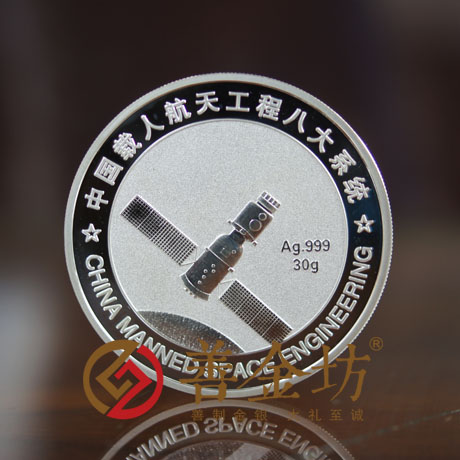 正面为测控通信系统图案,背面为载人飞船系统图案,直径40豪米,重量30克,成色Ag.999,配以高档木盒包装,工艺采用国际一流领先压铸工艺精制,有镜面、磨砂、浮雕工艺等