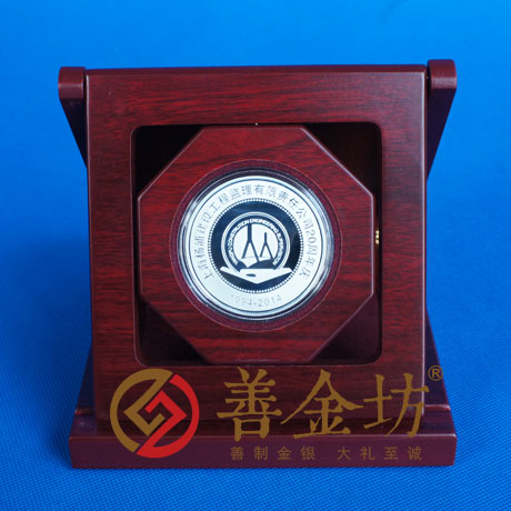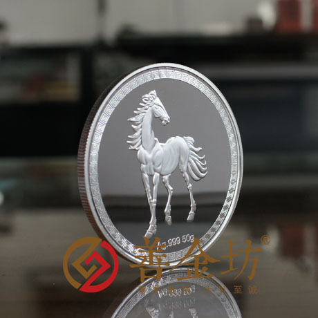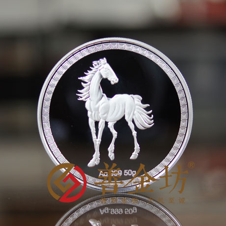 正面图案:镌有“上海杨浦建设工程监理有限责任公司20周年庆”、“1994-2014” 字样及logo图案。背面图案:骏马图案及Ag.999 50g。