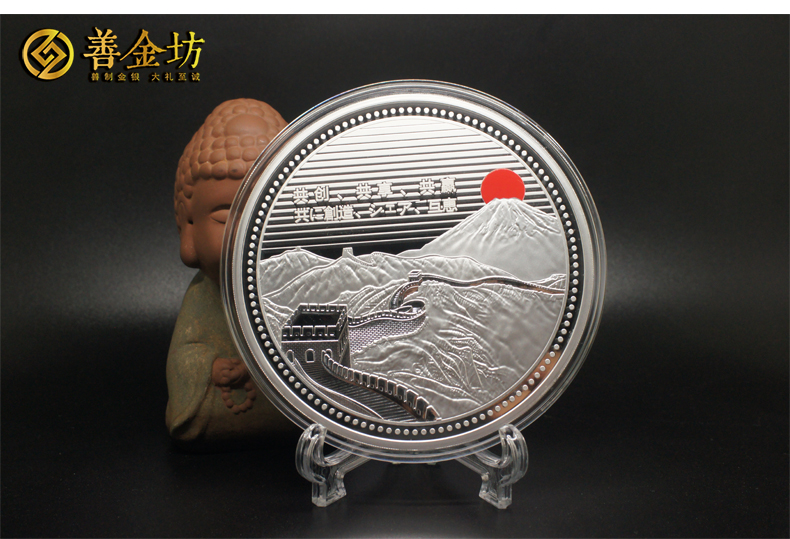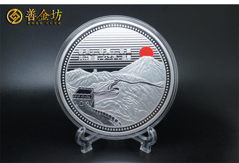 背面图案:镌有“共创”、“共享”、“共赢”中日文字样,点漆太阳图案加长城图案。