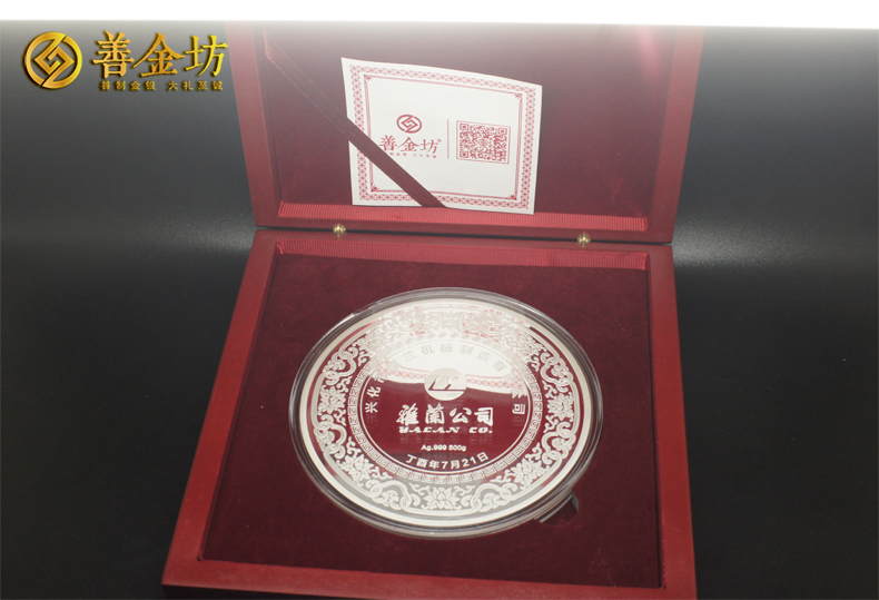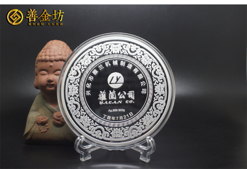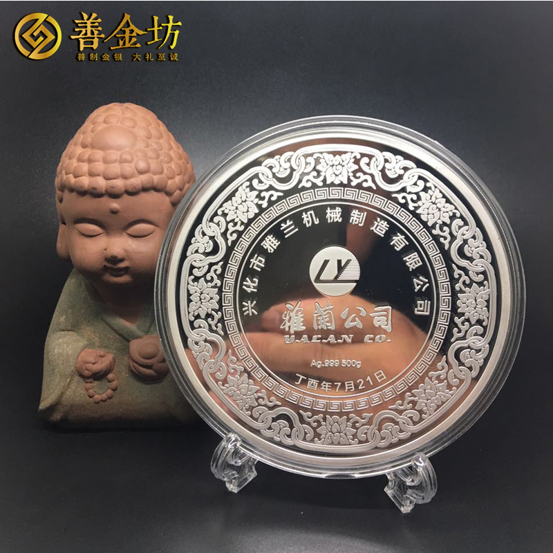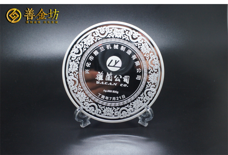 正面图案:镌有“兴化市雅兰机械制造有限公司”、“Ag.999 500g” 字样,logo图案。