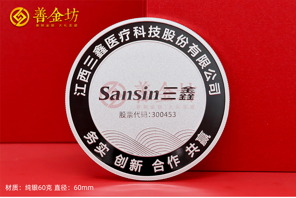 江西三鑫医疗科技有限公司“5G+智能工厂”项目纪念: 为庆祝江西三鑫医疗科技有限公司的数字化转型,我们定制了一款直径60毫米、重60克的银质纪念章。正面印有公司名称和LOGO,背面展示了“5G+智能工厂”项目的具体内容,寓意公司在新时代下的快速发展。