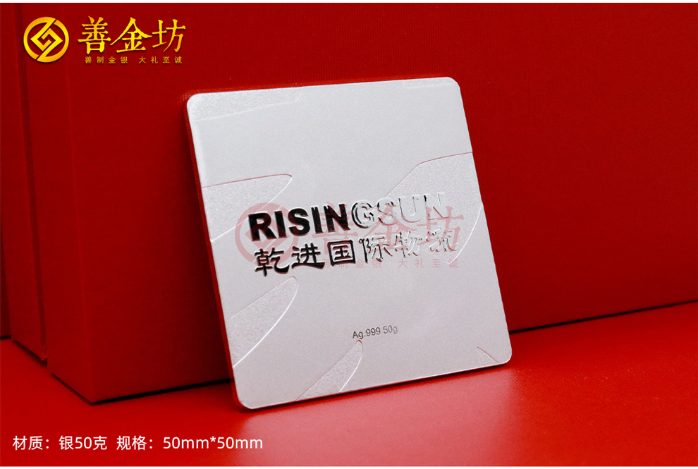 银章背面则印有乾进国际物流的公司标识“RISINGSUN”及中文名称“乾进国际物流”,彰显公司品牌形象与企业文化。此外,“Ag.999 50g”的字样清晰地标明了银章的纯度和重量,代表着银章的珍贵价值。通过这种专属设计,银章不仅是对员工辛勤工作的肯定,更传达了公司对员工的关怀和激励,激励大家在未来继续携手前行,共创辉煌。